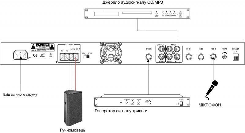 Виходи гучномовців:100 В. 70 В ~ 4-16 Ом