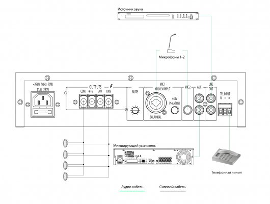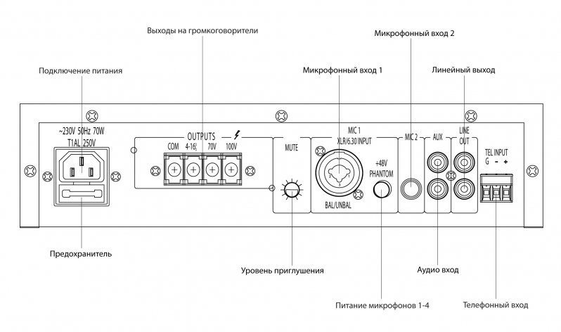 Виходи гучномовців:100 В. 70 В ~ 4-16 Ом