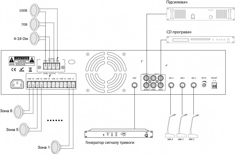 Вхід MIC1 типу jack з пріоритетом на передній панелі. 3 мікрофонні входи типу jack на задній панелі з пріоритетом другого рівня. Передбачено два лінійних RCA входи та один лінійний вихід RCA. Лінійний вхід ЕМС типу jack на задній панелі має найвищий пріоритет. Існує можливість регулювання рівня вихідного сизналу з передній панелі окремо по кожній з 6-ти зон. Виходи на гучномовці 70 В, 100 В та з опором 4-16 Ом.