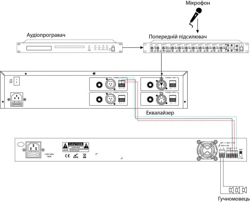 підключеної лінії гучномовців має бути не більше 80% від номінальної потужності підсилювача.