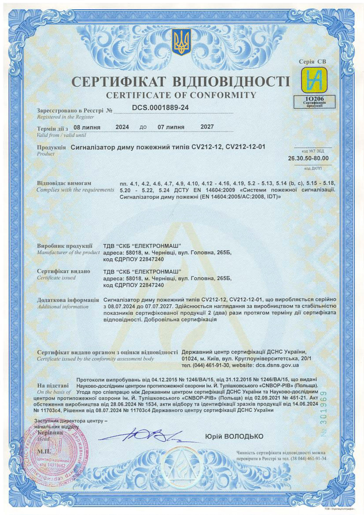 Сертифікат відповідності - Завантажити