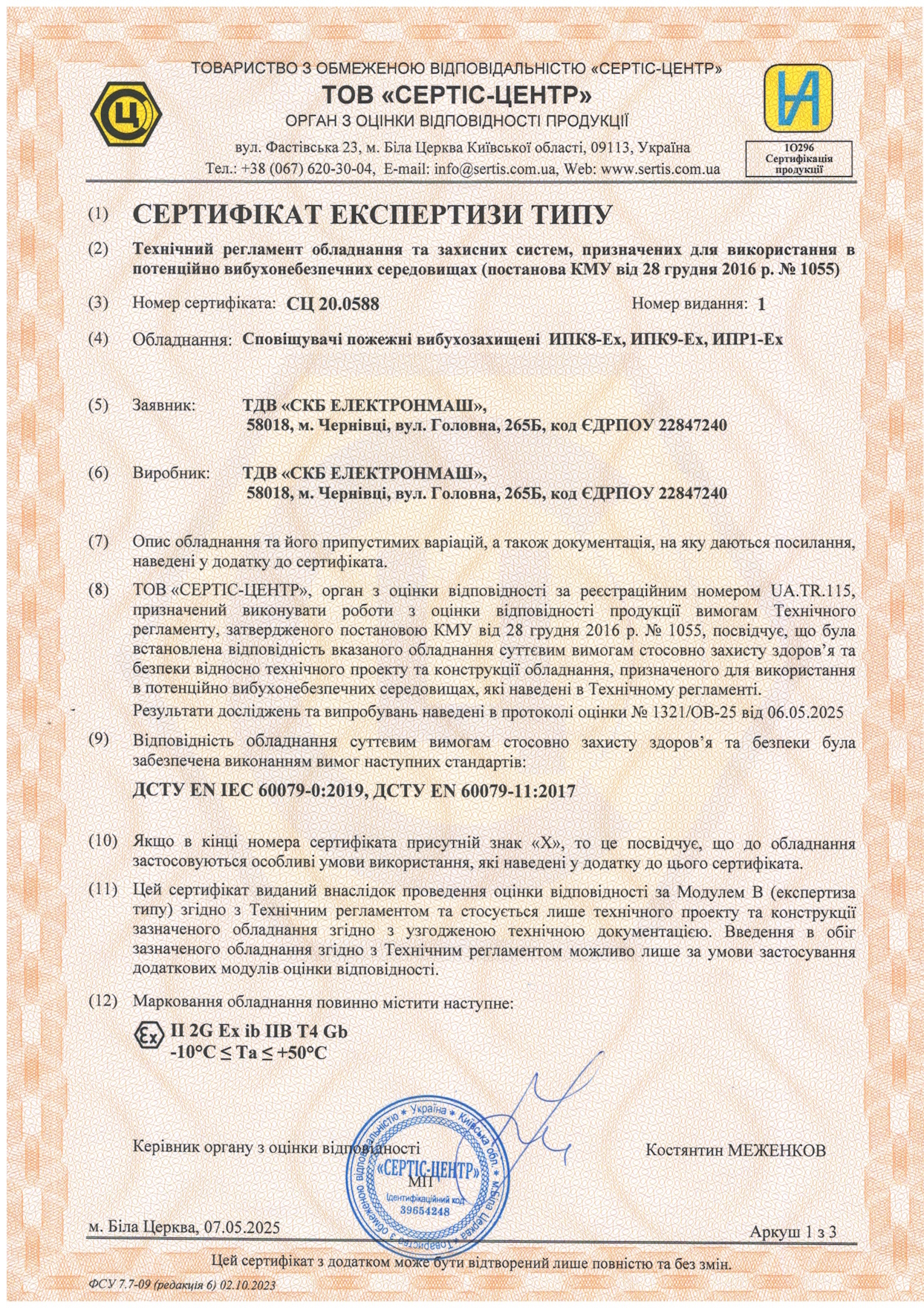 Сповіщувач пожежний ручний типу «ИПР-1Ех» відповідає вимогам Технічного регламенту обладнання та захисних систем, призначених для використання в потенційно вибухонебезпечних середовищах (Постанова КМУ від 28 грудня 2016 року №1055). Сертифікат експертизи типу № СЦ20.0588 вибухозахищеного обладнання. Ліцензійна угода № UA.115.L.B.0588-20 від 09.11.2020 на застосування сертифіката типу.
